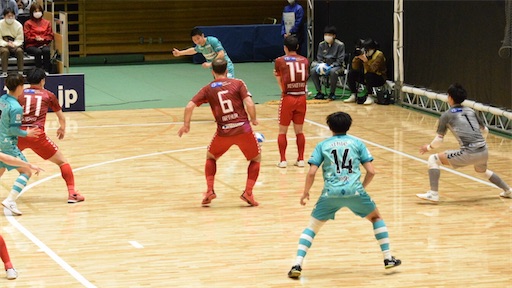キックオフから攻勢を仕掛けるのはリーグ戦王者の名古屋オーシャンズ。名古屋といえばスロースターターなイメージがあるが、早い時間からプレスラインを上げ、うまくピヴォに縦パスを当てて立川•府中を押し込む展開となる。